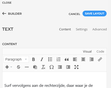 Verander je iets in de builder in de tekst aan de linkerzijde, dan zie je dat direct op je pagina aan de rechterzijde. Sla je vervolgens je wijziging op via SAVE LAYOUT, dan is je wijziging ook direct in je live website zichtbaar.