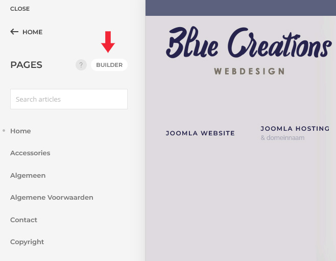 Nadat je de juiste pagina hebt aangelikt zal je zien dat de BUILDER zich ook aanpast met de inhoud van die pagina en laat de inhoud van die pagina zien.