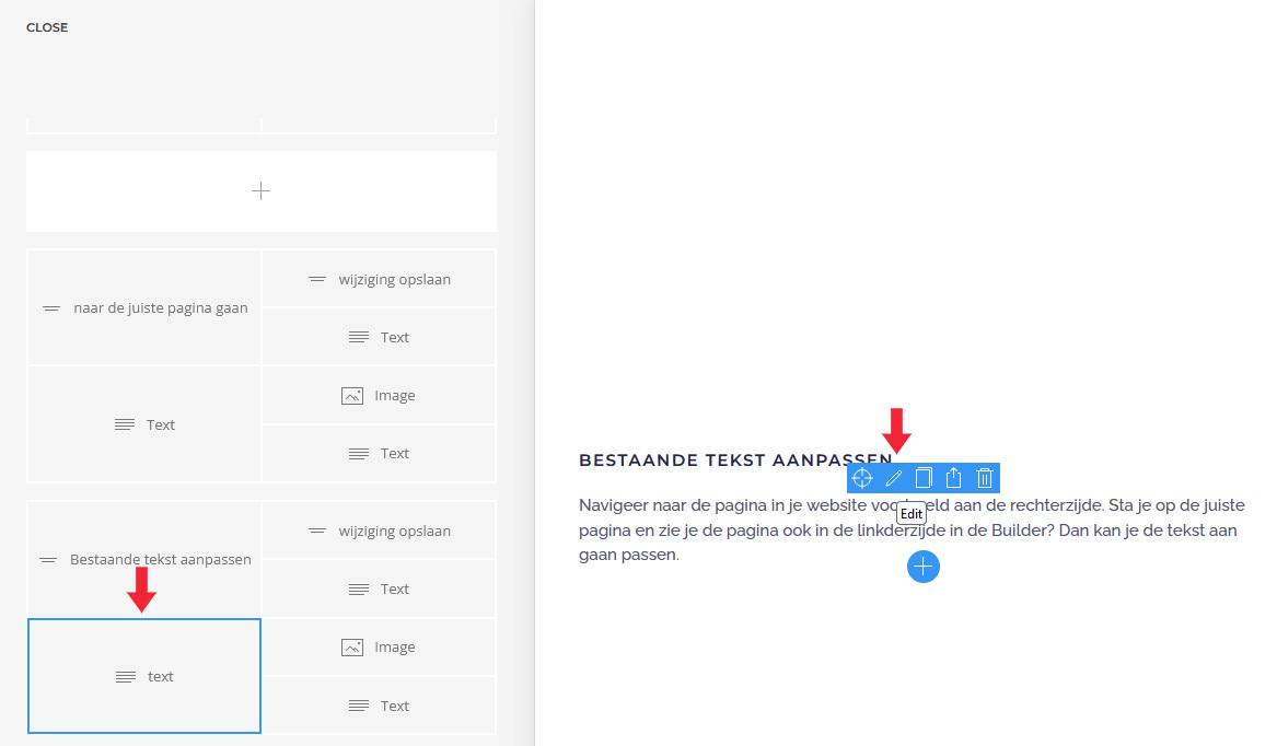 Als je met je muis over het stuk tekst beweegt wat je aan wilt passen zie je een klein menu verschijnen. Klik op het potloodje (2e icoontje van links). In de builer opent het juiste tekst element en je past de tekst aan.