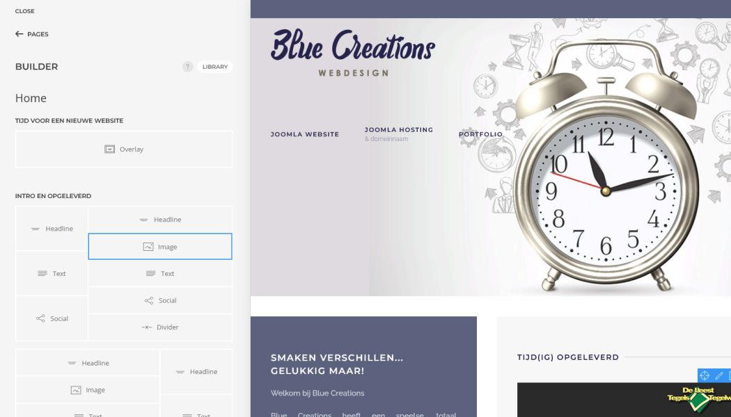 Als je met de muis over de blokken beweegt, zie je aan de rechterzijde een vierkant rond de items in je website voorbeeld verschijnen. Verschijnt het blokje om het stuk tekst dat je aan wilt passen? Dan klik je op dat element in de builder en je past de tekst aan.