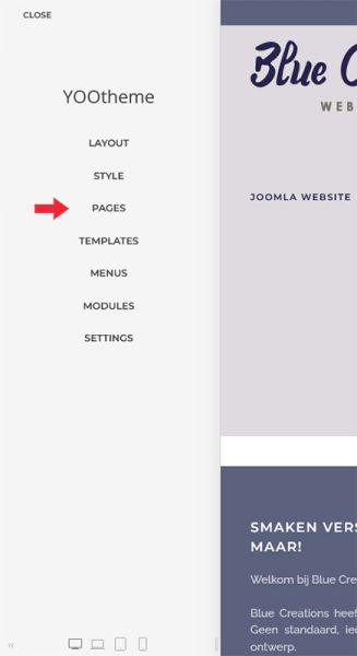 Je zie nu het YOOtheme menu en je kiest voor PAGES